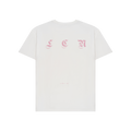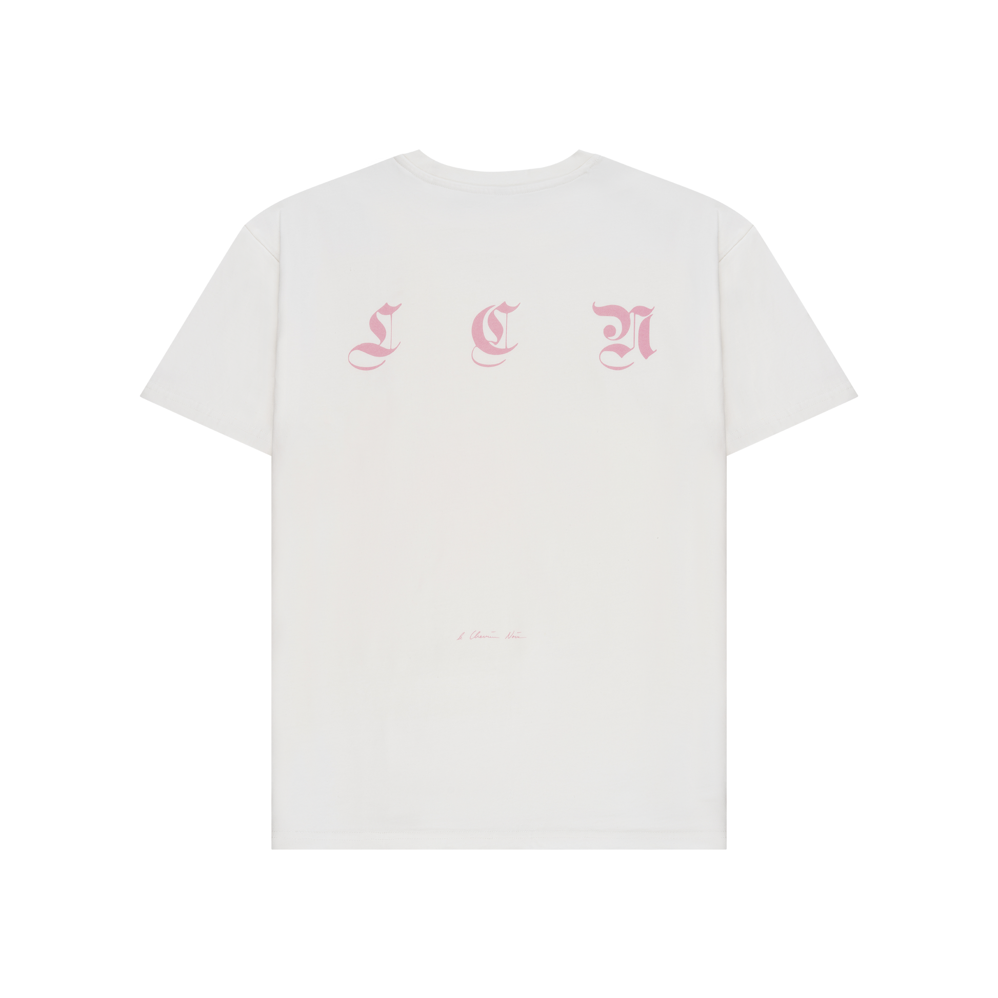 This blancwhite T-shirt showcases 'LCN' in old English with the signature logo at the bottom, blending classic typography with modern streetwear.